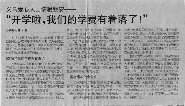 2010年8月30日,義烏商報第二版以《義烏愛心人士情暖磐安——開學啦,我們的學費有著落了!》為題,報道了義烏民建會員何維良、黃志云、龔前進在磐安結對助學的事跡。