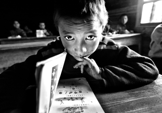應(yīng)敏說:“那是第二天早上,我穿衣起床來到這所學(xué)校。剛走進(jìn)教室,我就被邊咬小拇指邊翻書的小男孩吸引住了。我對(duì)著他友好地叫了一聲‘小朋友’,聽到叫聲后,他突然抬起頭,睜大著一雙渴望的眼睛。抓住這個(gè)瞬間,我摁下快門。”