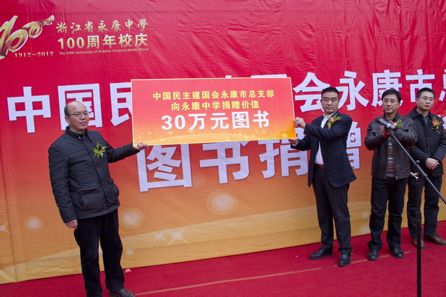 12月25日下午,值永康中學(xué)百年校慶之際,由民建永康市總支部捐資30萬元設(shè)立的永康中學(xué) “民建圖書館”舉行揭牌暨圖書捐贈(zèng)儀式。中共永康市委常委、統(tǒng)戰(zhàn)部部長王國人,副市長戴翀和民建永康市總支部主委吳明根等參加了圖書館揭幕儀式。