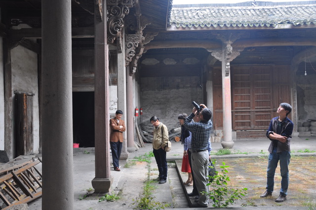 嚴店村現有多處古建筑,風格獨特,結構精巧。調研組一行考察了敦倫堂戲臺、清末民居,還重點考察了浙江省文物保護單位“嚴氏宗祠”。考察中,調研組人員對精湛的木雕工藝、古樸的建筑布局驚嘆不已,同時也發現保護中存在不少亟待解決的問題:一是受到雷擊、水災、蟲蟻災害等侵蝕,毀損嚴重;二是村民保護意識弱,以新補舊,破壞嚴重;三是缺少整體古村落保護規劃,舊村改造中原拆原建嚴重。