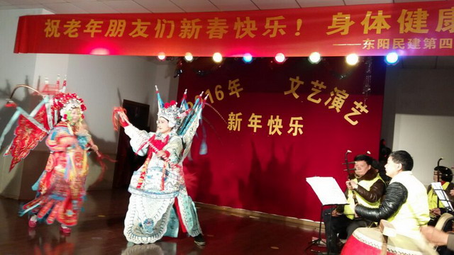 民建會員吳新祺、傅國榮和文化志愿者共30余名表演者,為老人們送上歌曲《母親》、婺劇《楊宗保與穆桂英》、黃梅戲《為救李郎》、越劇《金玉良緣》等十余個精彩的戲曲、歌舞表演節目。受到了老人們的歡迎,贏得了陣陣掌聲。