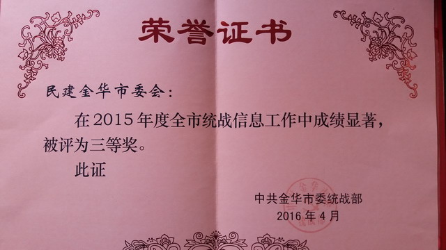 日前,中共金華市委統戰部下發了《關于2015年度全市統戰信息工作的通報》,對全市統戰信息工作進行表彰。其中民建金華市委會獲2015年度全市統戰信息工作先進單位三等獎,會員王惠雄被評為信息工作先進個人。