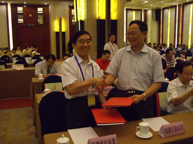 9月10日—12日,值“2009重慶•寧波周”在渝舉辦之際,寧波市政協副主席、民建寧波市委會主委張明華率會員企業家組成的經貿代表團赴渝開展經貿考察活動。全國政協常委、重慶市人大副主任、民建重慶市委會主委盧曉鐘接見代表團一行并座談,民建重慶市委會副主委王濟光、沈金強,重慶江津區代區長關海洋、副區長李祖明等陪同。