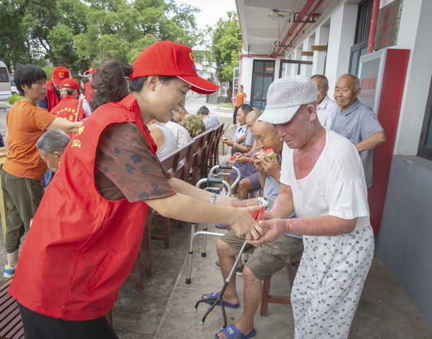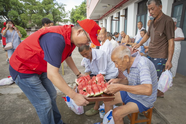 儀式結(jié)束后,志愿者們頂著驕陽(yáng)、冒著酷暑,趕赴定海區(qū)小沙街道開展“走進(jìn)敬老院送清涼”志愿服務(wù)活動(dòng),親手為老人們送上一份份夏季清涼用品和瓜果,并看望了臥病在床的老人,余斌副主委囑咐老人保重身體,安享黨和政府的溫暖與經(jīng)濟(jì)社會(huì)發(fā)展的成果。
