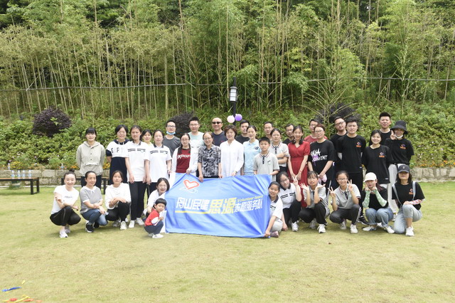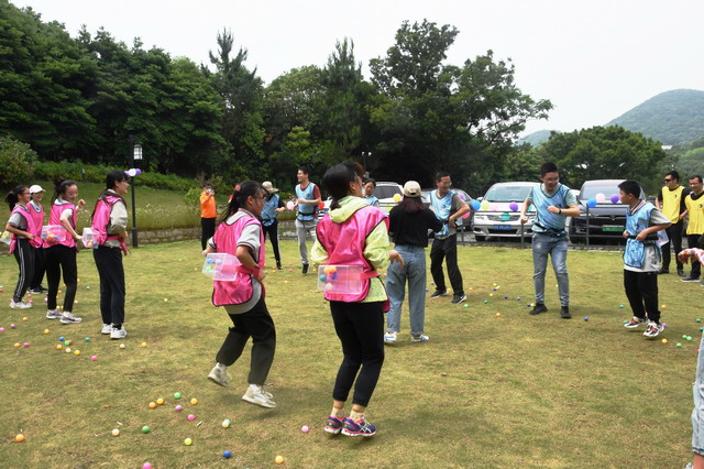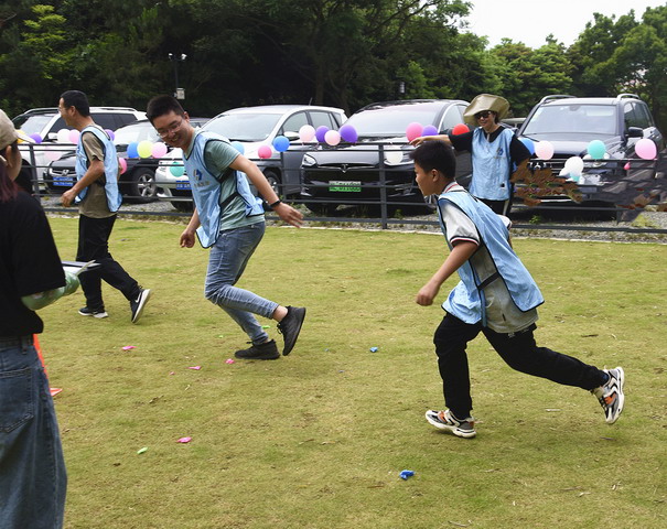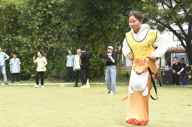活動現場首先進行了一場為學生量身定做的戶外拓展大賽。14名師生和16名民建會員依次組成紅、黃、藍、綠4支隊伍,在各隊隊長的帶領下團結協作、相互配合,從開始盲目松散慢慢變得步調一致,利用團隊的力量和智慧完成了“電動小馬達”、“袋鼠跳”等項目,場地上處處洋溢著清脆的笑聲和加油聲。最后一個是難度最大的核心訓練項目——“串燒接力賽”。需要5位隊友分工合作,依次完成踢毽子、跳繩、扔沙包、壓爆氣球、原地轉圈、彈瓶蓋等動作,最終“綠隊”以無縫的配合、精準的節奏奪得了最終的勝利,獲得“最佳團隊”稱號。