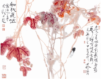 此次展覽共展出作品100余件,新作《宋之問詠山陰詩十二屏》,洋洋灑灑,行云流水、跌宕起伏,全篇氣脈貫通,激情澎湃,把他對歷史濃郁、文人輩出的山陰的仰慕之情躍然紙上。蔣頻以書入畫,書畫并舉。從大師名家的作品中深受啟發(fā),在筆墨、構(gòu)圖上下足了“意象臨摹”的功夫。展覽中呈現(xiàn)給觀眾的荷花、芙蓉、飛雁、蟬趣、山水等作品,恰到好處地把他對所見景物的感受,大膽潑辣而又飽含激情地抒發(fā)在筆墨之間。