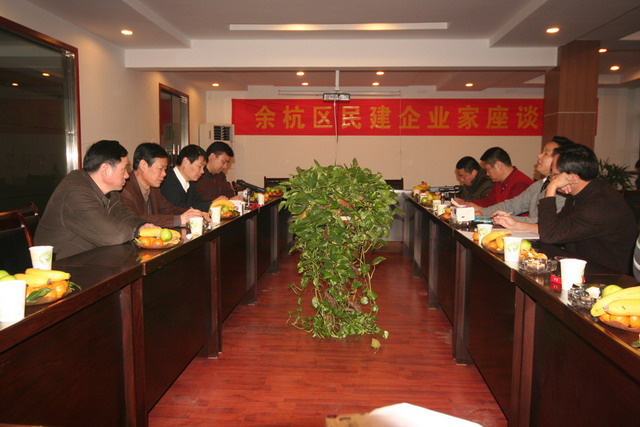 12月15日下午,2009年民建余杭支部企業家座談會在會員企業吳建龍新落成的杭州福杭輕工材料有限公司商務樓6樓會議廳舉行。民建杭州市委會秘書長吳彥、社會服務處處長洪穎志、余杭區統戰部領導、余杭支部企業家組成員、余杭支部負責人等參加會議。