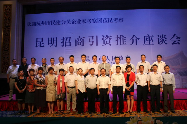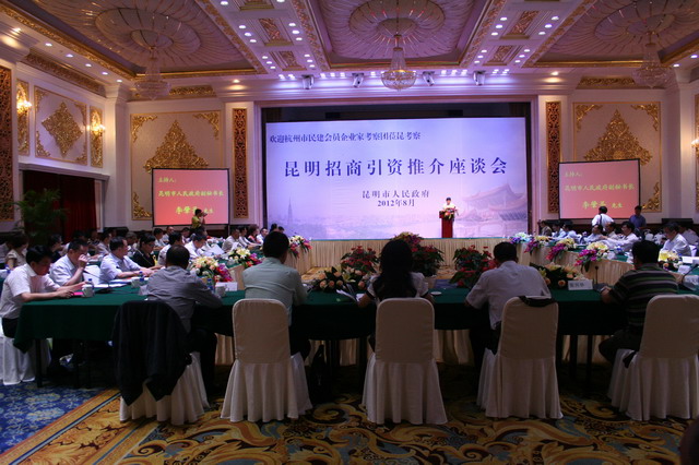 2012年8月12—13日,民建浙江省委會主委、杭州市副市長、民建杭州市委會主委陳小平,民建杭州市委會副主委、民建會員企業家聯誼會會長、金都房產集團總裁吳忠泉,民建會員企業家聯誼會常務副會長、杭州金屋國際裝飾材料有限公司董事長朱新風帶領會員企業家20人,前往春城昆明參加招商引資推介座談會。民建杭州市委會副巡視員、秘書長吳彥,副巡視員洪穎志,組織處處長壽遐、宣傳處處長王萍及機關干部參加了座談會。此行考察目的是圍繞加快推進產業轉型升級和經濟發展方式的轉變,學習借鑒昆明促進發展的好經驗,為會員企業家創業創新戰略尋求兩市在旅游、文化創意、房產建筑、高新技術以及制造產業等領域的合作,積極鼓勵和支持民建會員企業家到昆明投資發展,同時也歡迎昆明的企業家來杭州投資興業,共同促進兩市經濟社會的繁榮發展。