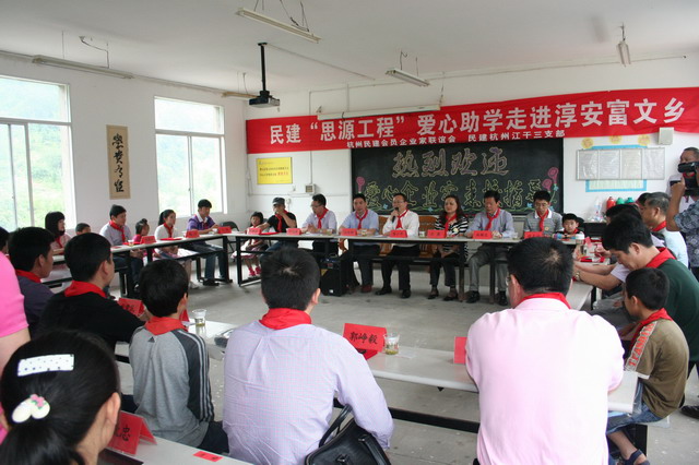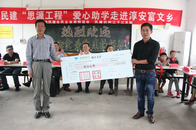 民建杭州市委會副巡視員洪穎志代表企業家聯誼會通過“思源工程”專項資金向富文鄉中心小學捐贈5萬元愛心助學款,江干區三支部的會員企業家與該校20名困難學生建立了結對資助并現場捐贈了第一批助學金和學習用品。
